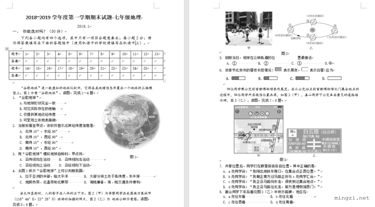 2018~2019学年度第一学期期末试题-七年级地理2019.1
