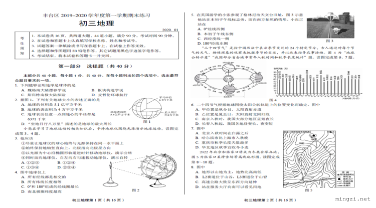丰台区 2019-2020 学年度第一学期期末练习初三地理2020. 01