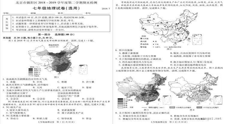 北京市朝阳区2018~2019学年度第二学期期末检测 七年级地理试卷(选用)2019.7