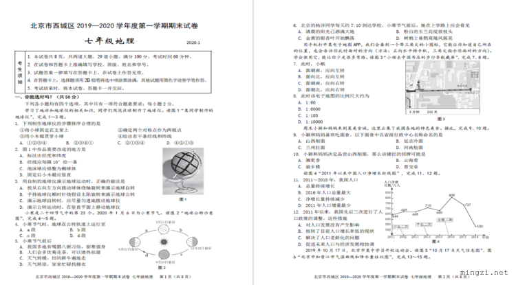 北京市西城区 2019—2020 学年度第一学期期末试卷 七年级地理2020.1